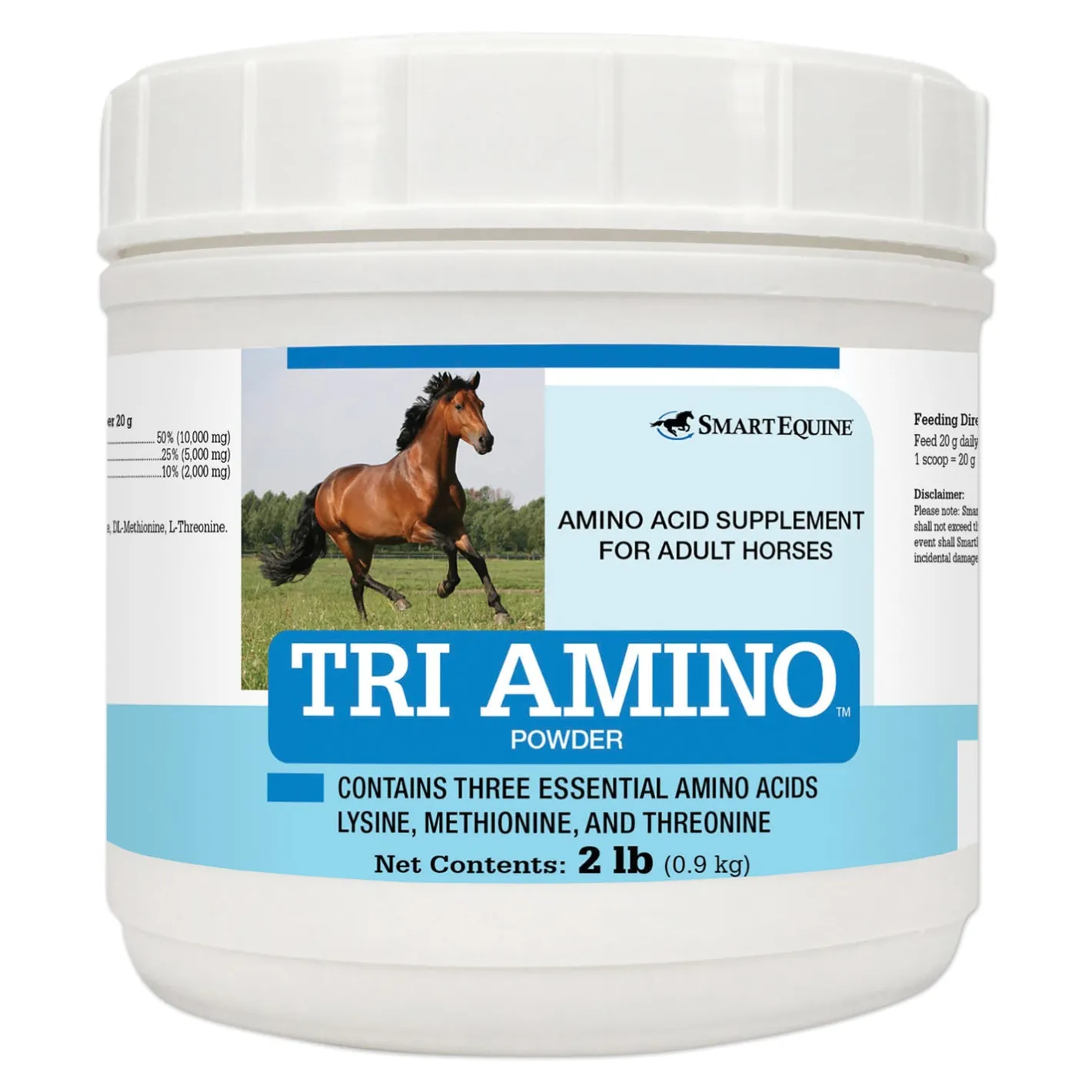 Tri-Amino by SmartEquine™ for horses contains the three most essential amino acids: lysine, methionine and threonine, which must be supplied in the diet as horses cannot make enough of their own. This equine performance supplement is ideal for horses with diets deficient in protein. Lysine aids in bone health and immune function. Methionine supplies essential sulfur, which can function as an antioxidant, support hair coat and mane density and play a role in the synthesis of structural proteins, especially for the hooves and connective tissues. Threonine aids in normal immune function. Feed at a rate of 1-2 ounces daily. Guaranteed analysis for each 20 gram scoop of Tri Amino: L-Lysine 10 g, DL-Methionine 5 g, L-Threonine 2 g.