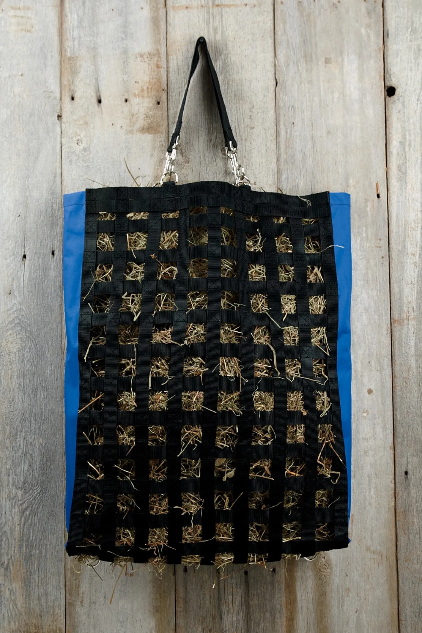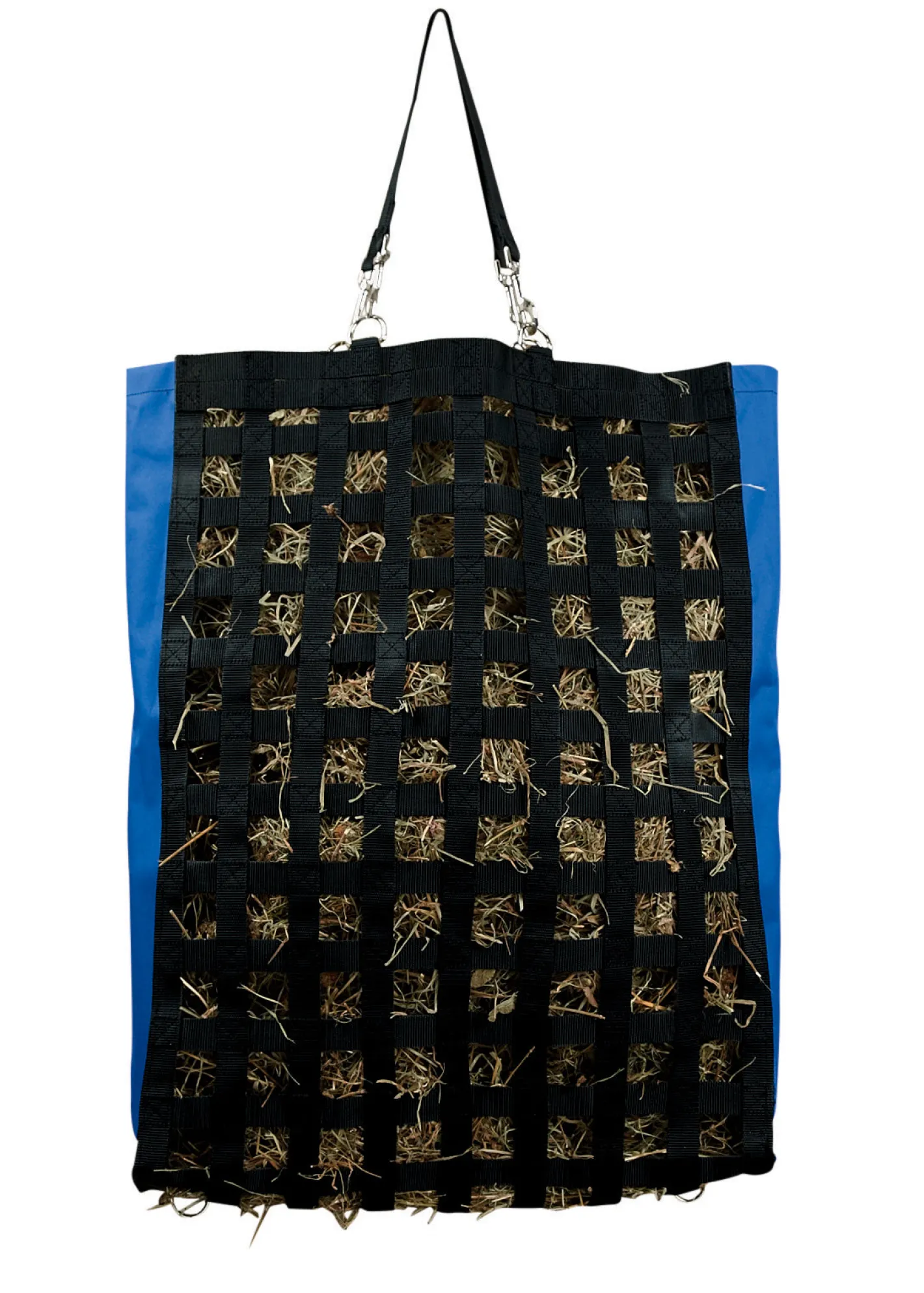 The Slow Feed Hay Feeder has small square holes that prevent the horse from eating hay too fast, which aids in good digestion. This hay bag also helps reduce mess and waste. It works well in trailers and includes a convenient hanging strap. 1 3/4″ x 1 3/4″ squares and a 6″ deep opening. 27″H x 21″W.