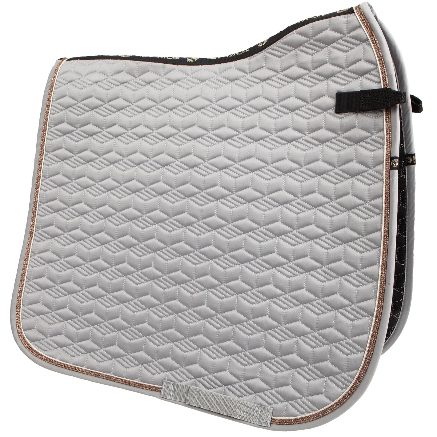 The Toklat® Tango Geometric Dressage Pad is a perfect partner to your dressage saddle. It features a luxurious satin top, a distinctive geometric quilt pattern and shimmering silver metallic trim. This saddle pad is also lined with soft, waffle-shaped wicking material to provide heat and moisture management.