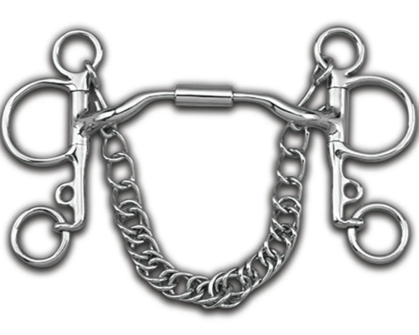 The free-rotating barrel with low port uses less tongue pressure and collapses onto the bars. The curved mouthpiece permits the horse to swallow more freely and distributes pressure evenly.