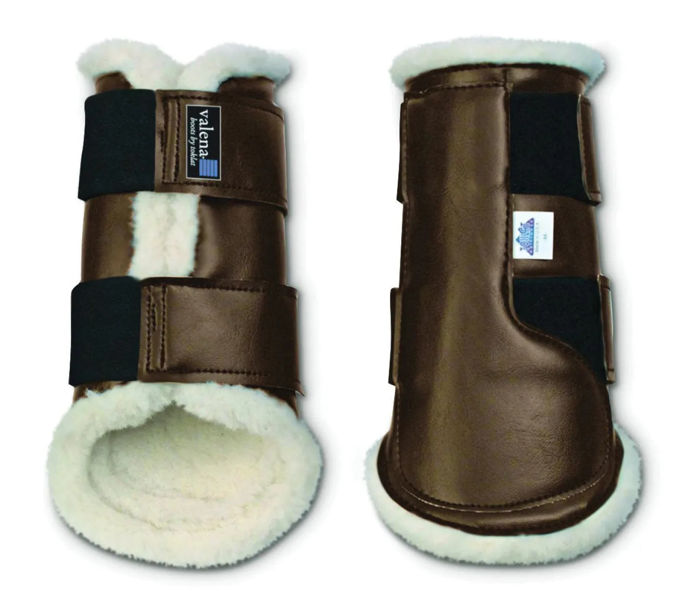 Sized for the horse’s back legs, Valena Tall Hind Boots feature WoolBack linings for extra protection, comfort and moisture-wicking. Exteriors are made of durable, heavy-duty vinyl with wide elastic and VELCRO® brand straps for quick and secure fastening. WoolBack is a dense pile wool fabric that protects against concussion while it naturally wicks moisture. Fleece stays lofty. Easy care. Small 11″W x 10 1/4″H, Medium 12 1/4″W x 11 1/4″H, Large 12 1/2″W x 11″H, X-Large 13″W x 11 1/4″H.