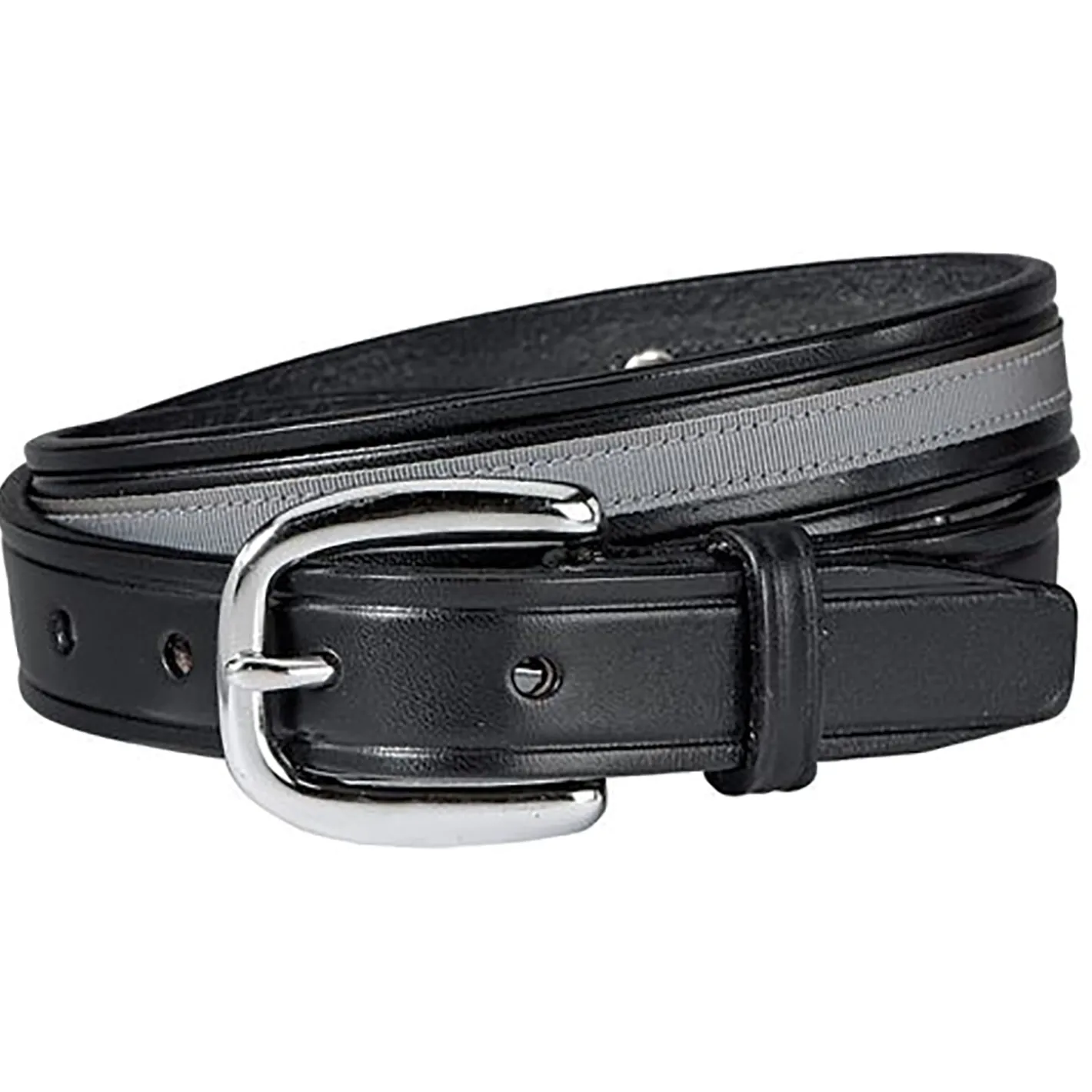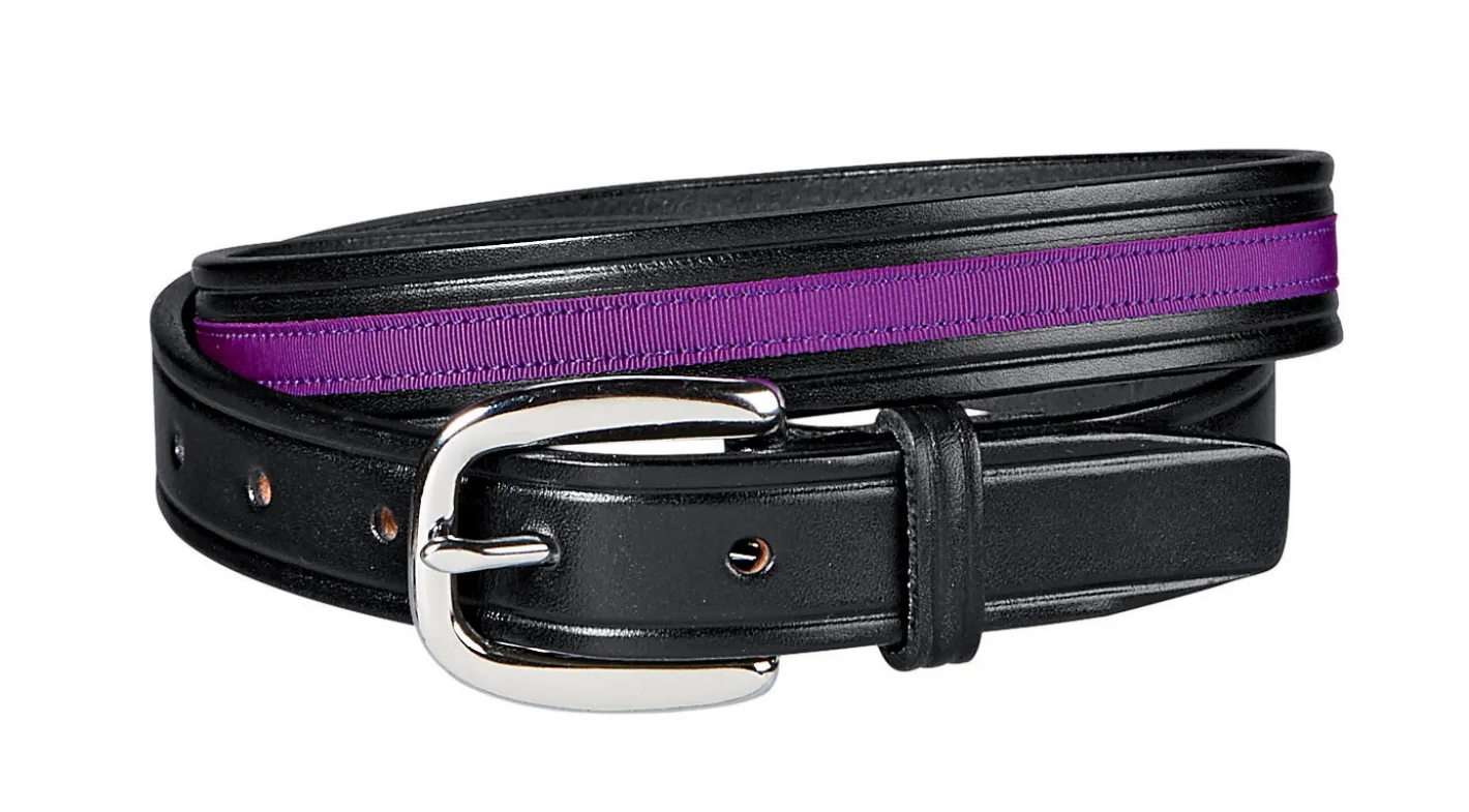 Add equestrian style and a pop of extra color with this Tory Leather Ribbon & Snaffle Bits Belt! Made in the USA from fine 1″ wide bridle leather, it has creased edges, two snaffle bits and a center overlaid with simulated ribbon. Sewn-on buckle.
