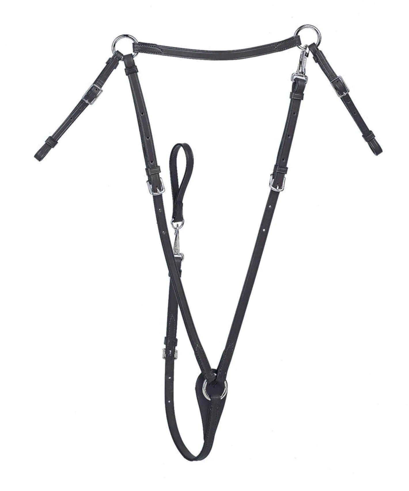 Tory’s best-selling Flat Hunt Breastplate features 5/8″ wide flat bridle leather that is vegetable tanned in the USA. Adjustments on the fork straps and tie down strap. Wither snap and girth loop for easy on/off. Center ring has a leather paddle; girth loop attaches is snap.