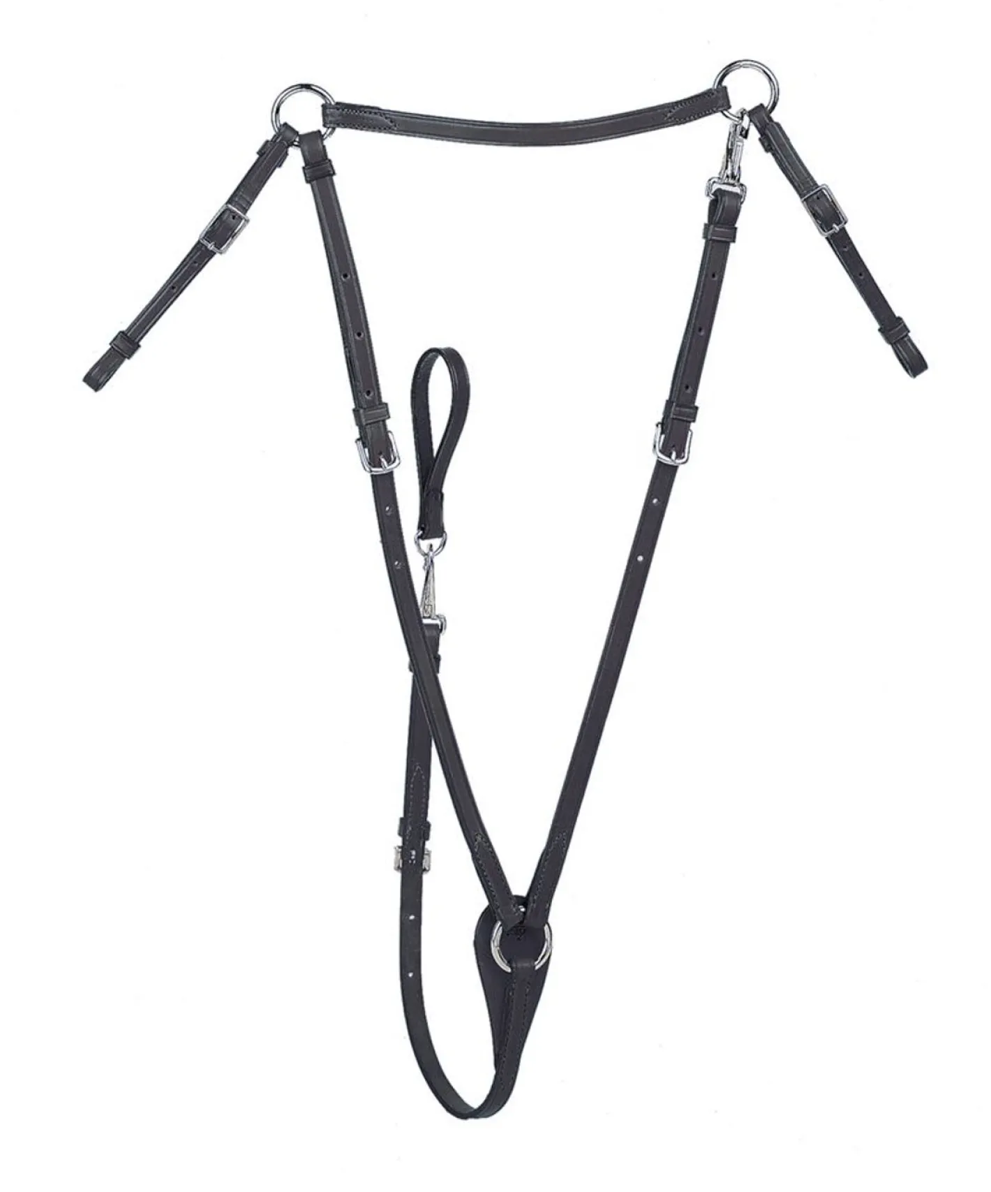Tory’s best-selling Oversize Flat Hunt Breastplate features 5/8″ wide flat bridle leather that is vegetable tanned in the USA. Adjustments on the fork straps and tie down strap. Wither snap and girth loop for easy on/off.