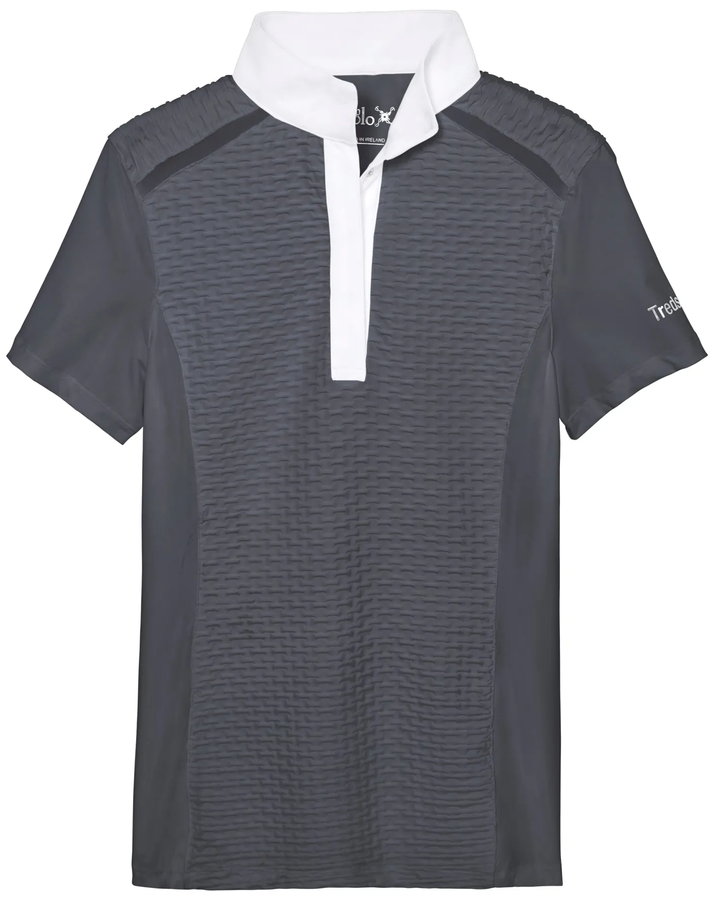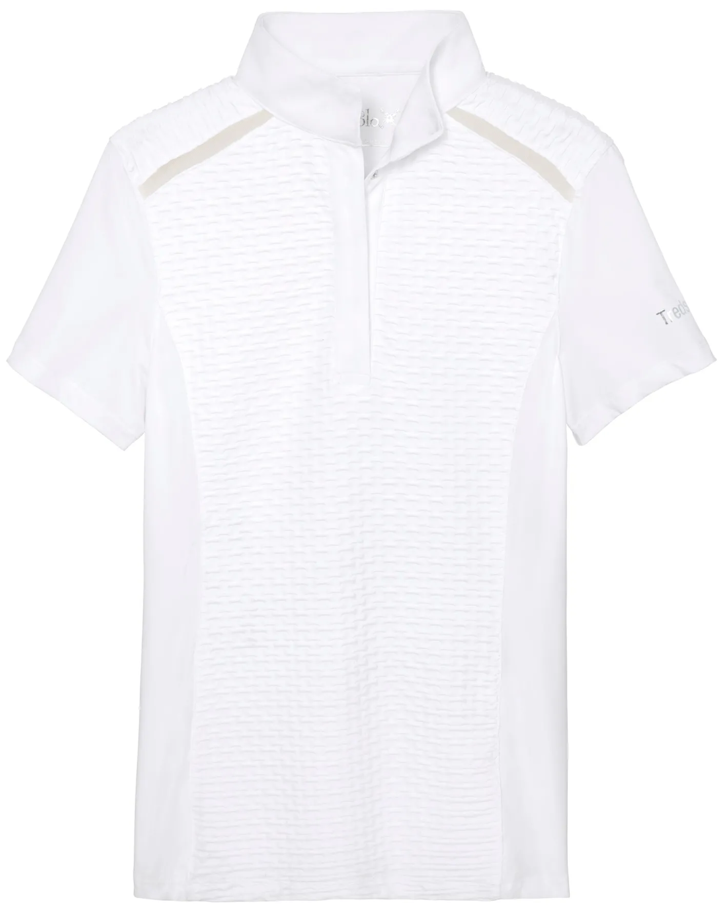 The Tredstep™ Solo Pearl Show Shirt adds contemporary twists to classic show styling with textural front, back and shoulder panels and mesh inserts along raglan shoulder “seams.” Lightweight stretch panels at the sides and sleeves ensure your freedom of movement. A ventilation grommet at the nape lets heat escape. Stand collar and covered placket for a polished presentation.