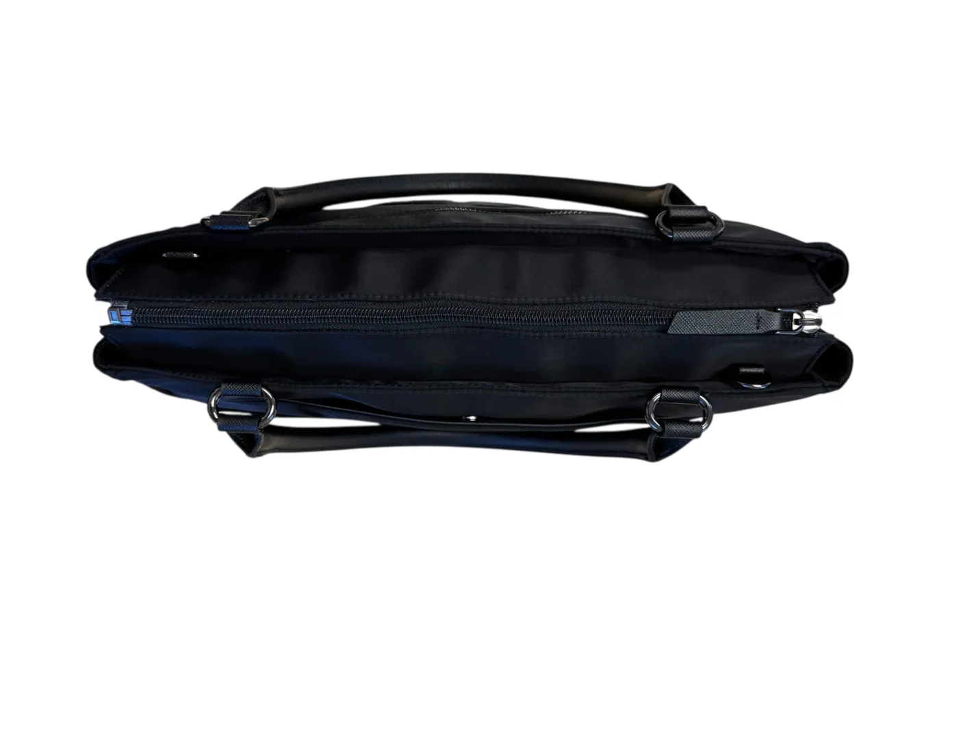 Carry your equestrian style to your work spaces and beyond with the Tucker Tweed Equestrian™ Medium Office Tote. This nylon/leather upscale tote is a pocket powerhouse! Interior pockets for laptop, drink, phone, cords and more. Exterior completed with gunmetal hardware, matching zipper pockets both front/back and trolley sleeve. Includes adjustable shoulder strap. Fits 13″ PC/14″ MacBook laptop.