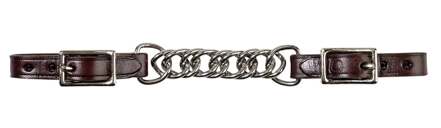The Walsh™ Curb Chain with Leather Ends pairs a stainless steel curb chain with soft bridle leather buckle ends for easy on/off. Leather ends have multiple holes to allow the perfect length adjustment with the bit. Stainless steel buckles.