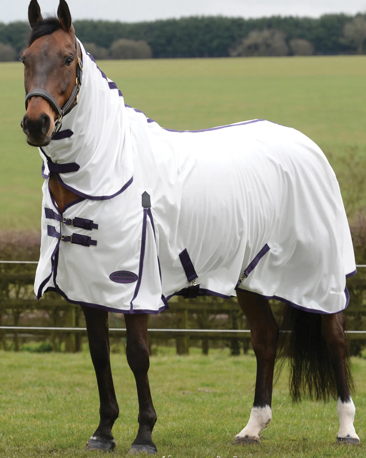 The WeatherBeeta® ComFiTec™ Essential Mesh II Combo Neck in soft mesh offers protection against flies. This sheet is breathable, cool and blocks 65% of ultraviolet rays. A 210T nylon lining at the shoulders, mane and tail help to protect hair, while traditional side gussets allow natural movement.