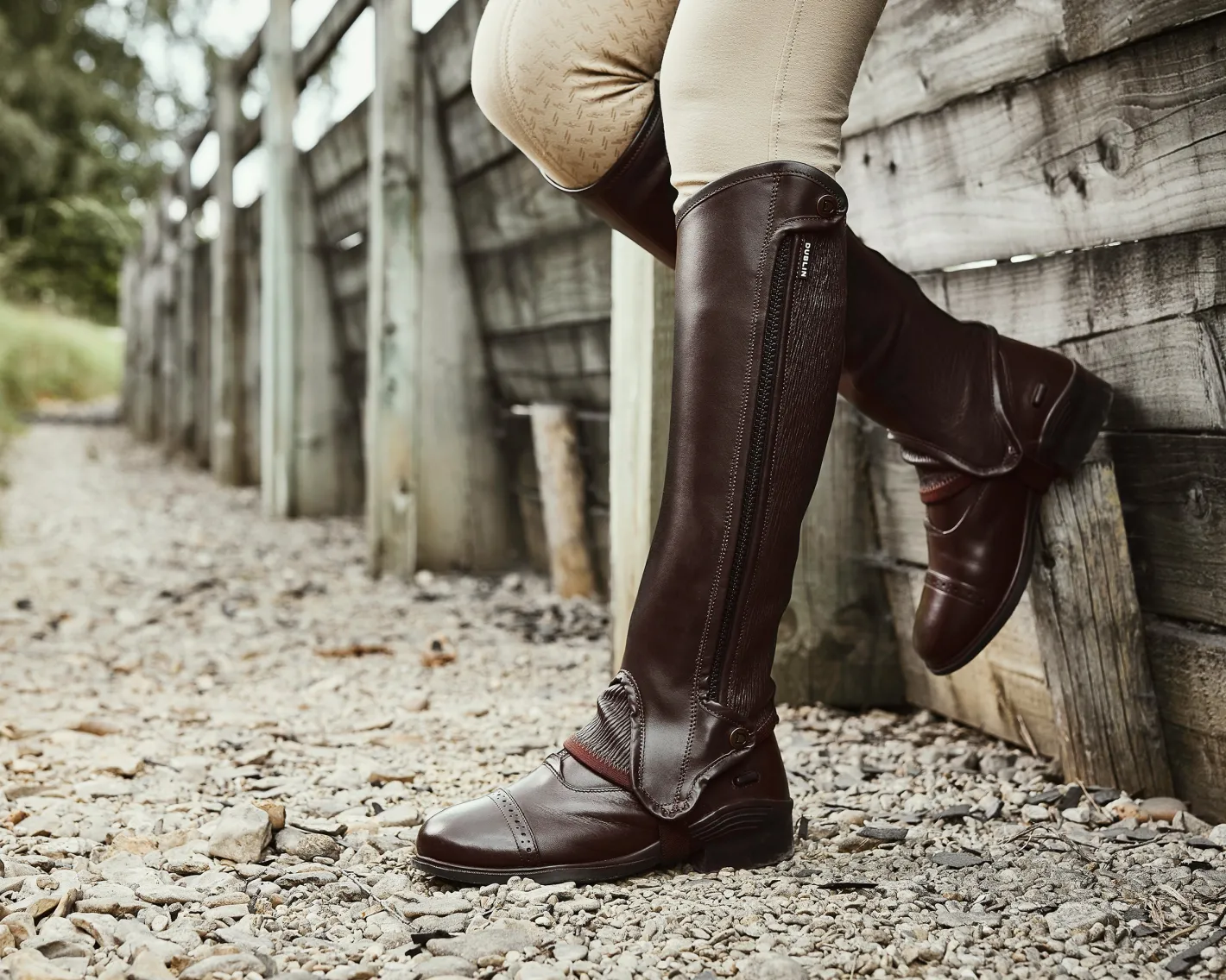 The Dublin® Evolution Side-Zip Half Chap is perfect with an Evolution paddock boot. Crafted of luxurious, high-quality and soft full-grain European leather, it has an elasticized leather calf for a close and comfortable fit. The strong and reliable YKK® side zipper is topped with a Dublin branded press stud keeper.