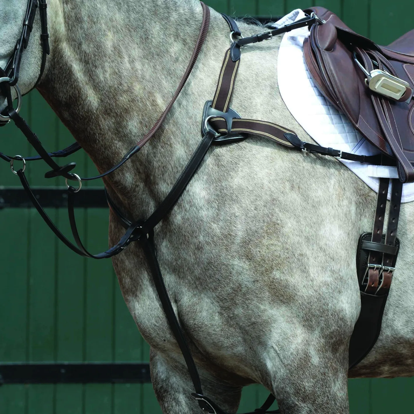 Attaches to a saddle at five points to reduce slipping. Removable martingale attachment.