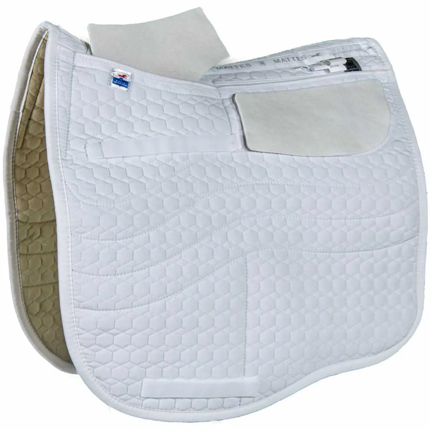 Part of the Mattes Correction System collection, this quilted dressage pad has four pockets to hold Poly-Flex® Shims. It can be used to help maintain balance and straightness of the saddle for horses that change form through a season or have asymmetries.