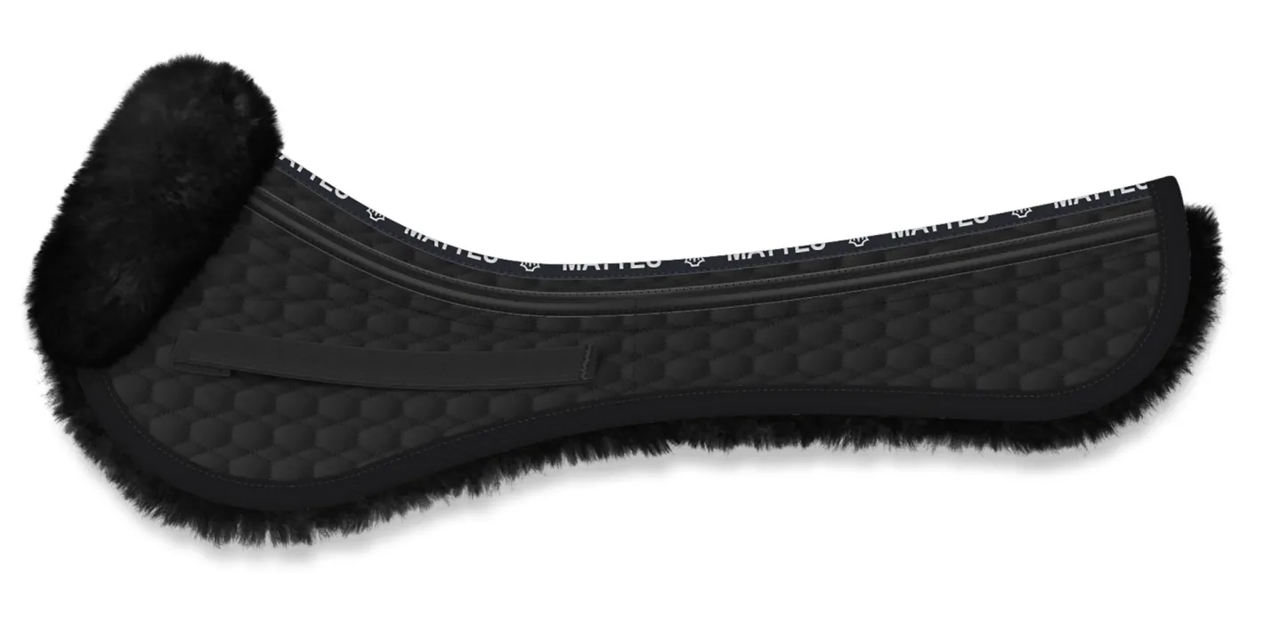 The latest design from E.A. Mattes: the Platinum EWWA Sheepskin All-Purpose Correction Half Pad. Designed specifically for high-withered horses, it has an extra-wide wither area. It helps reduce or eliminate pressure in the wither area and supports a proper saddle fit. The EWWA Pad maintains the patented Spine Free® design, with the channel opening lower on the wither.